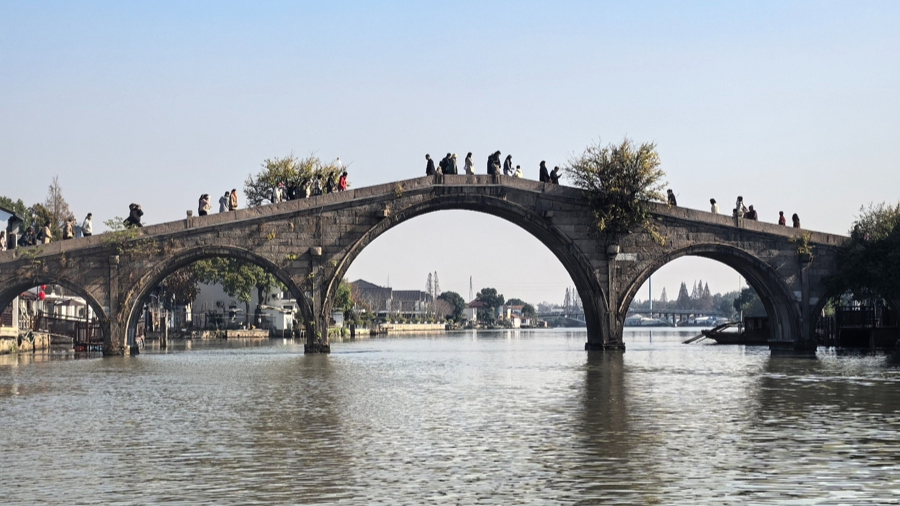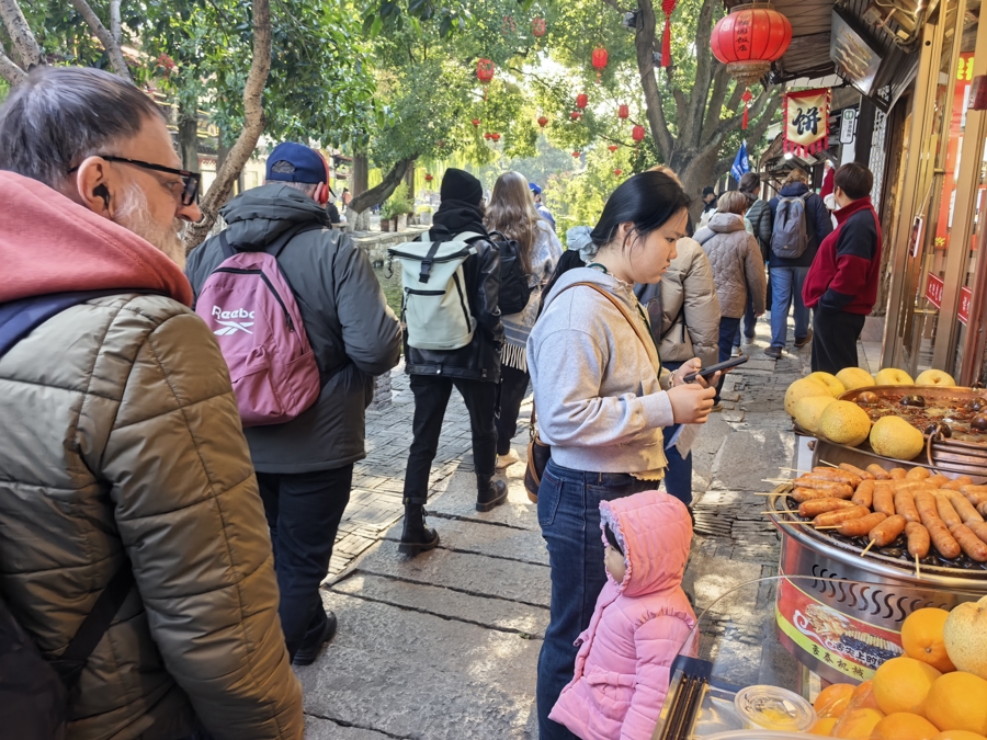 游船慢悠悠穿梭在小桥流水间,对面驶来一船金发碧眼的外国游客。河道狭窄处“擦船而过”,双方纷纷挥手拍照,相映成趣。上岸后,记者又偶遇一支俄罗斯旅游团,还有两位东南亚女孩在河边边吃零食边晒太阳。岸边小店年近七旬的爷叔还会说几句英语,主动向外国游客介绍自家售卖的冰糖雪梨特色食品。古镇工作人员透露,今年上半年朱家角古镇累计接待游客330万人次,其中海外游客占比近1/3,预计全年海外游客接待量将突破200万人次。